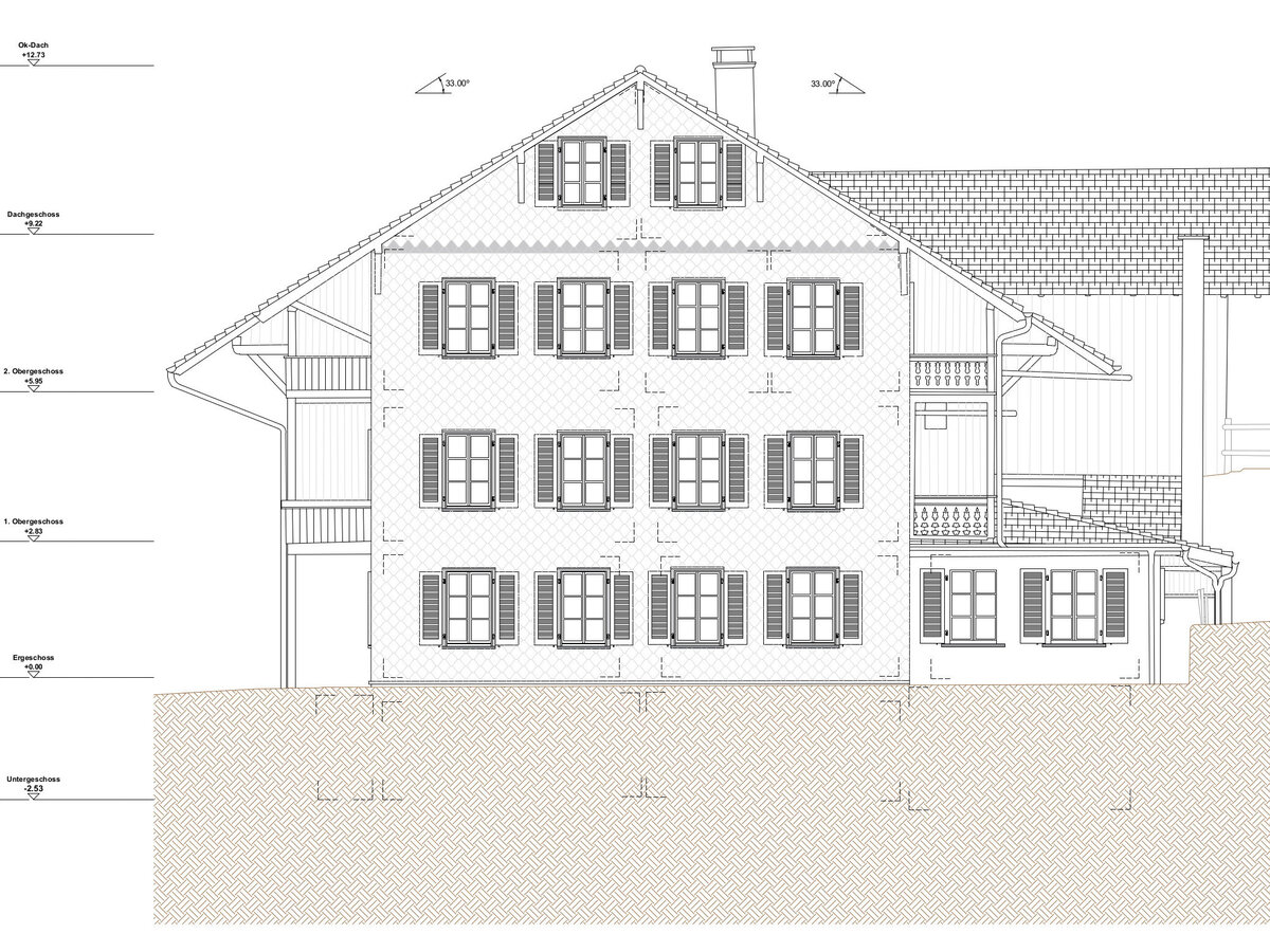 Eine sinnvolle Variante für die Baueingabe ist die Ergänzung eines einfachen 3D-Modells mit detailierteren 2D-Fassaden.
